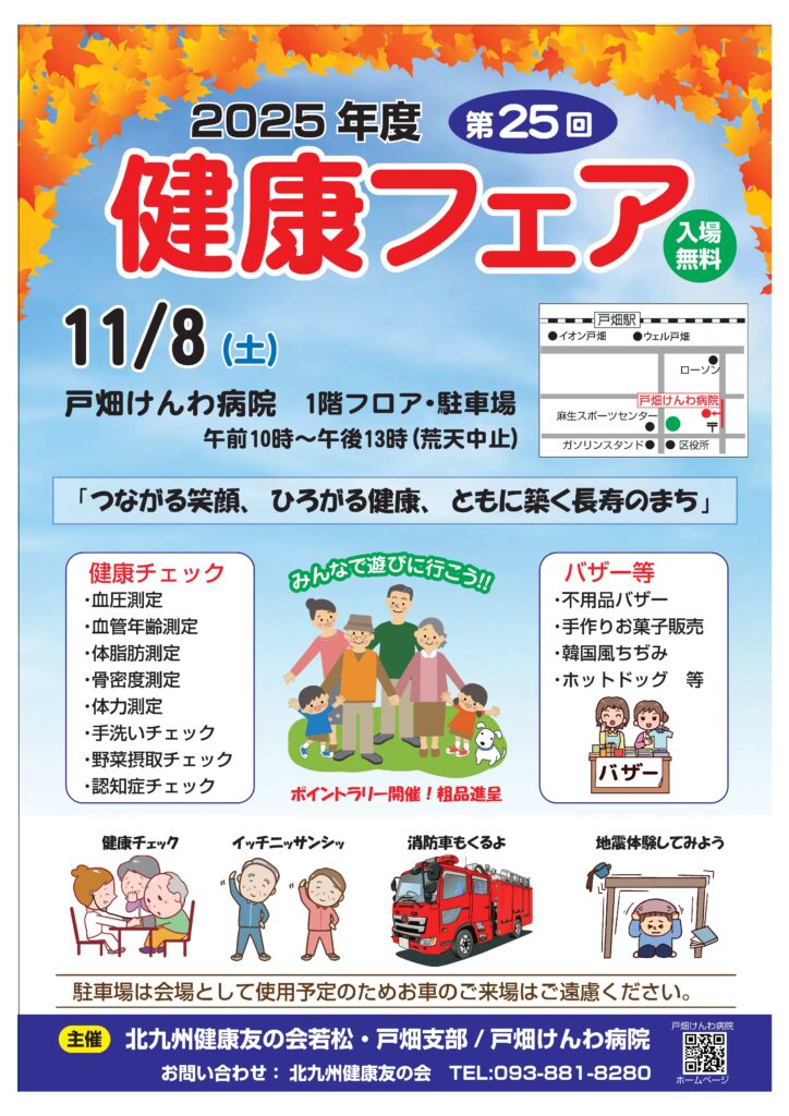 北九州健康友の会若松・戸畑支部と戸畑けんわ病院は、地域のみなさまの健康づくりを応援する「第25回健康フェア」を開催いたします。血圧測定や骨密度測定などの健康チェックをはじめ、バザーや手作りお菓子の販売など、楽しい企画を多数ご用意しています。どなたでも無料でご参加いただけますので、ご家族・ご友人お誘いあわせのうえ、ぜひご来場ください。